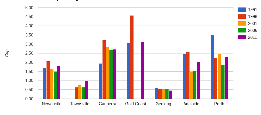 - In big cities, Cap decreases when a new team is added. Compare Perth’s Cap from 1991 to 1996 (Fremantle’s first season was 1995) and Adelaide’s Cap from 1996 to 2001 (Port Adelaide’s first season was 1997).
