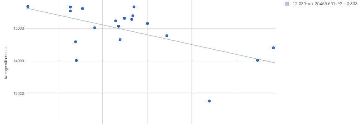 Look, I’ve know I’ve gone on about attendance this year, but this is interesting. Promise. The more competitive the season, the more people turn up. This relationship holds even if you remove an outlier year like 1998, which had really poor attendance due to an excess of games and it immediately followed the Super League shemozzle.