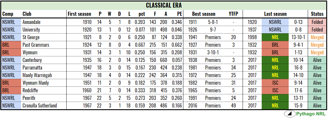 As the city of Sydney expanded westward from the harbour towards the Blue Mountains, new teams were added to the premiership. The first was Annandale in 1910, who played for ten years before a 0-13 season in 1920 and winning just a single game in three seasons saw them excluded from the competition. University joined that year and ended their run in the premiership in similar circumstances at the conclusion of the 1937 season, finishing 0-8 with barely two wins in the previous for years. Poor results can be as effective as bankruptcy in killing off clubs.