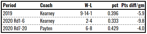 I don’t know how much reliable information can be gleaned from such an unusual year for one specific club. One thing I am interested in is measuring the differences in performances under Kearney (rounds 1 through 6) and Payten (rounds 7 to 20) to see if it was worth punting him.
