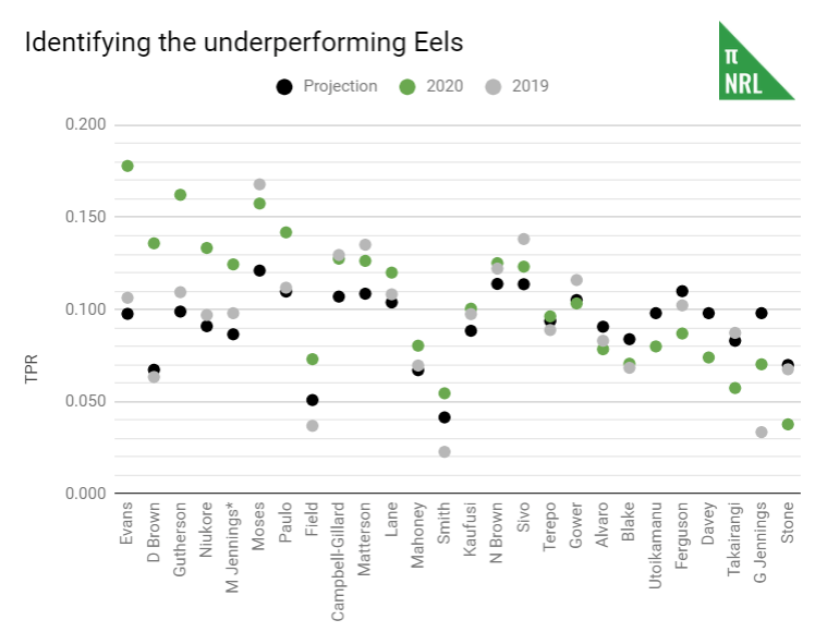 Mitchell Moses had the team’s third highest TPR and racked up the production but the Eels didn’t score enough points. Moses’ job is to turn field position into scoring opportunities. The Eels were fortunate to win as many games as they did, probably by avoiding being massacred by injuries like so many other clubs, but that weakness was shown up amply through the closing stages of 2020. It will be clearer still in 2021 when that advantage is eliminated, unless something changes.