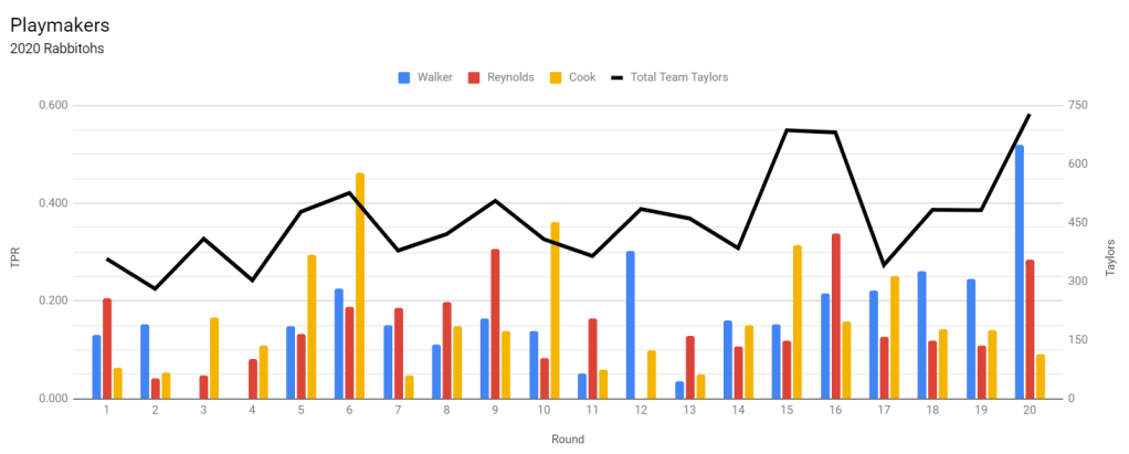 Souths’ spine is projected to be a full five Taylors per game better than Melbourne’s, which is next best, so it is little surprise that the Rabbitohs are the mostly heavily biased to their playmakers. Damien Cook is the keystone of the spine and has been the league’s most productive player by TPR two years running. The .200 barrier hasn’t been broken since Robbie Farah did it back-to-back in 2013 and 2014, years that the Tigers won a combined seventeen games. After two years of wrecking the league, have coaches finally watched enough tape of Damien Cook to put a lid on him? More pressingly, will Damien Cook turn up this postseason?