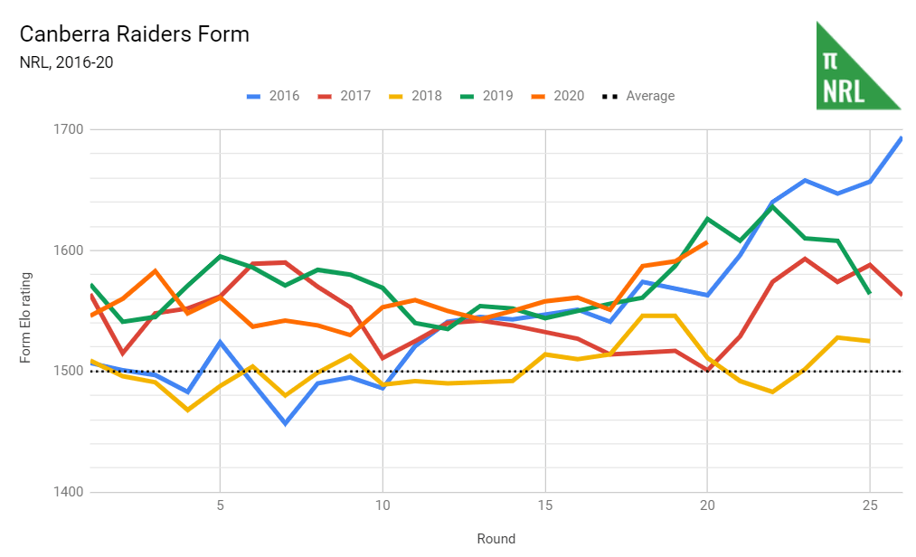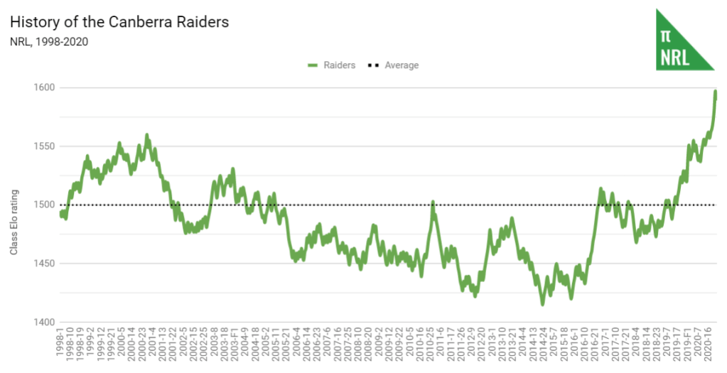 The Raiders’ class Elo rating of 1589 is now the fourth highest in the league behind the Storm (1715), Roosters (1635) and Panthers (1603). And then these last few years in closer detail.