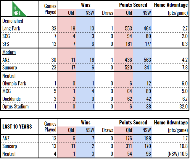 Suncorp has long been a fortress for Queensland. Since 2010, the home ground advantage has been worth over ten points to the Maroons. Equally, but with far fewer games, the neutral venues have been considerably more accommodating to the Blues. Go figure. The Blues have an advantage of less than two points at ANZ Stadium but as the memory of Queensland’s golden age fades from memory, I would expect it to return to its long term advantage of approximately four points.