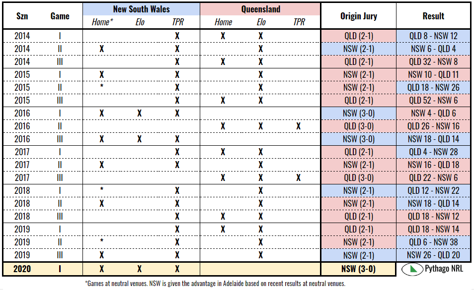 We’ve already established that the Taylors lean NSW and Elo, until recently, loved Queensland, so we’re really only left with home ground advantage to separate the teams. It’s hardly a good or useful or robust system but since someone will inevitably ask for it, here’s what an Origin jury would have tipped.