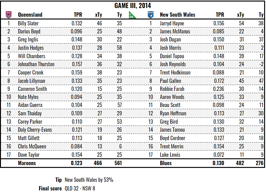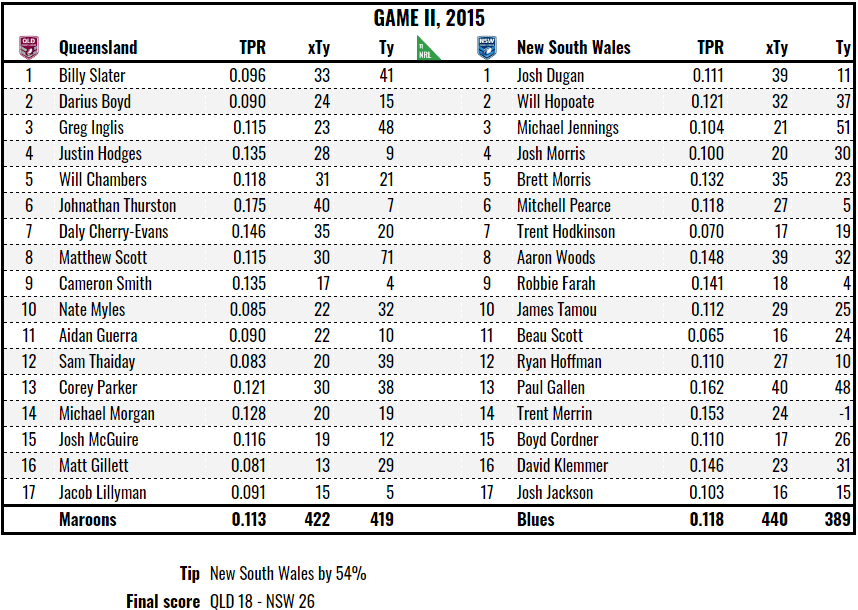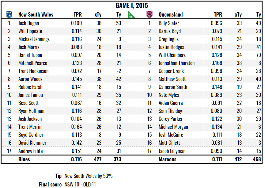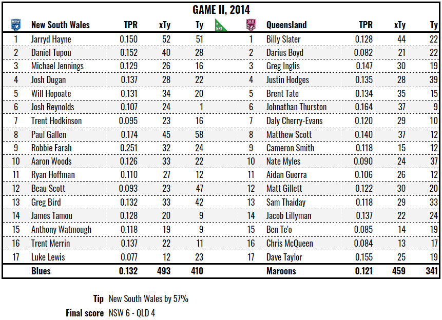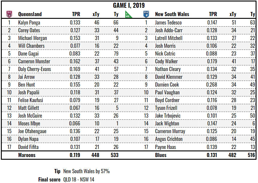 Queensland may well alter this line-up before game day. Personally, I would have preferred to see Harry Grant at hooker. His .174 TPR would have added an additional 13 Taylors and closed 14% of the gap between the two states. However, the Maroons appear to be in big trouble with the wingers and centres chosen. In a normal year, a functional Corey Oates would add another 6 Taylors over Xavier Coates but unfortunately, Corey is broken. Valentine Holmes’ addition on the other side would be a similar improvement. Nonetheless, these changes would close the gap a little but does not eliminate it.