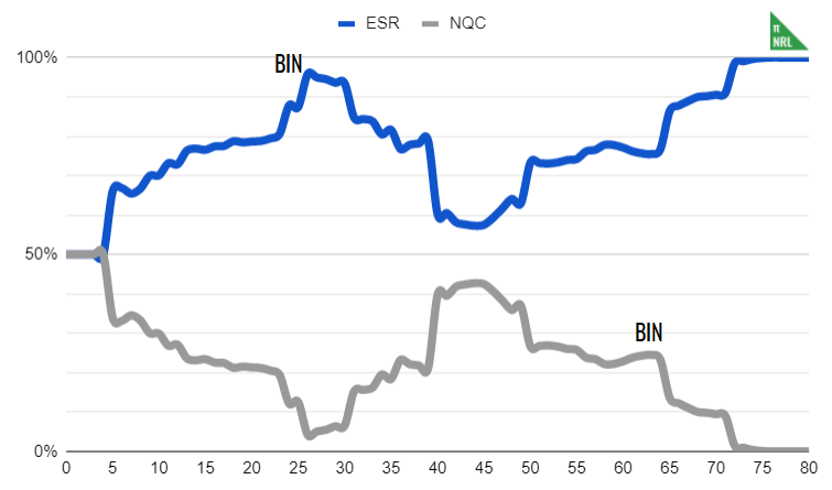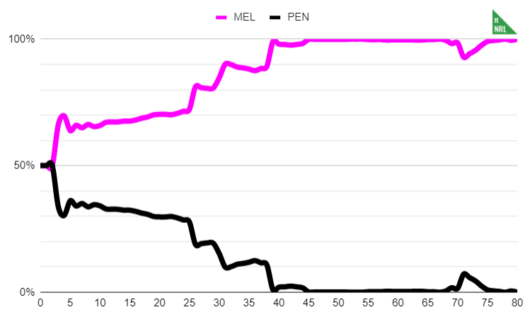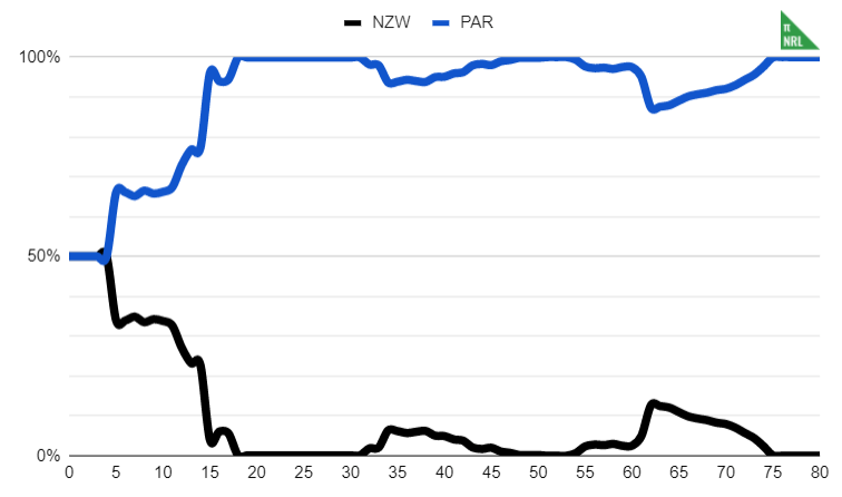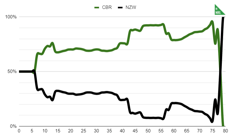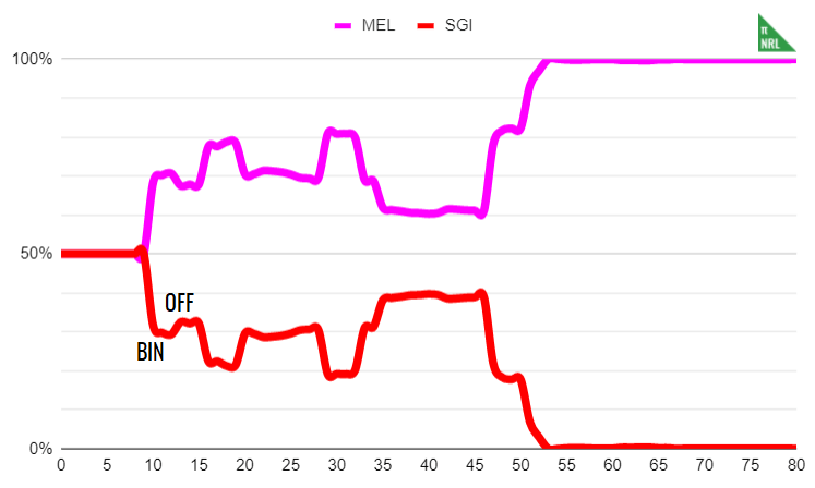 It’s that simple. I have used some averaging to smooth out rough edges in the dataset (especially for odd-numbered margins) and where there are too few games in the sample that the model’s results do not make sense, I have edited some of these manually. For example, a one point lead from half time through 60 minutes into the game should not have a less than 50% win probability for the leading team but it apparently does in the NRL.