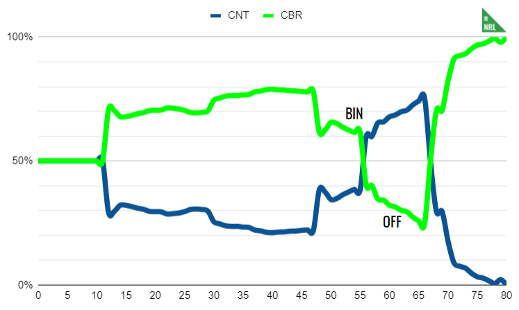 WCL has no overall predictive power but it can graphically summarise a game quite well with a layer of information that simply plotting the margin does not. The sum of team’s win probability percentages at each minute of the game gives a WCL score, which is indicative of how dominant the team has been. A tight game will have each team’s score close to zero, while a perfectly dominant game will have the winning team’s score close to 50 and the loser’s close to -50.