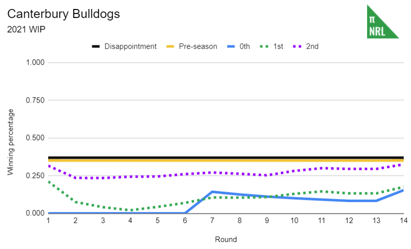 The projections are naturally more conservative (less likely to predict outliers) to cover the potential spread of results. Think of, for example, Penrith as having 15.6 projected wins plus/minus 3 wins. While some projections are right, it tends to overshoot really bad teams and undershoot really good teams.