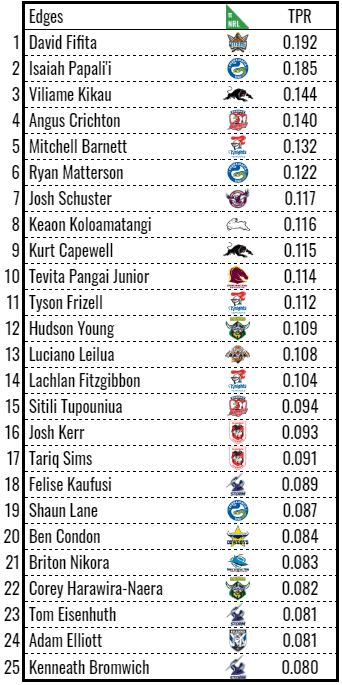 TPR as generated when the player is listed in that position so far this season (minimum five games).
