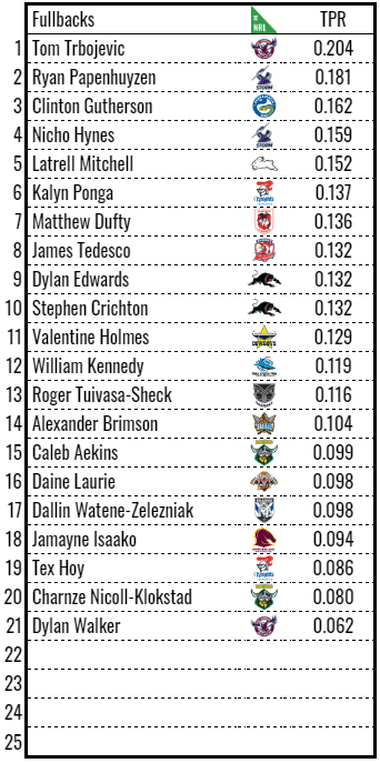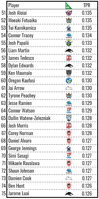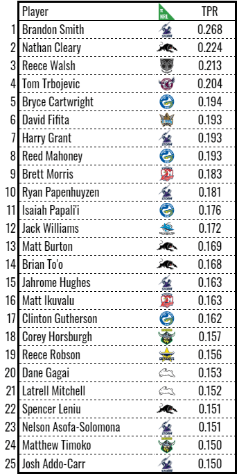 The 2020 regular season was topped by Cameron Smith with a TPR of .229. The career (2013 – now, regular season only, minimum 10 games) leaders are Harry Grant and Robbie Farah with a TPR of .164. The single regular season record holder is Robbie Farah with a TPR of .244 in 2013.