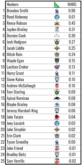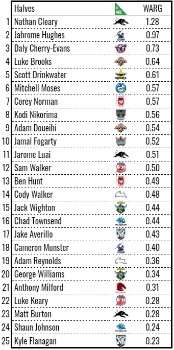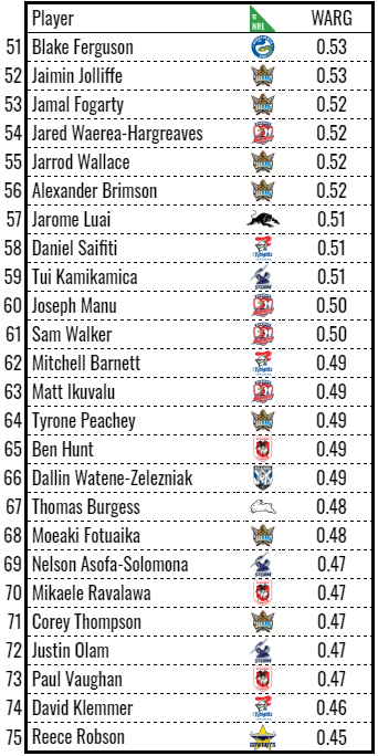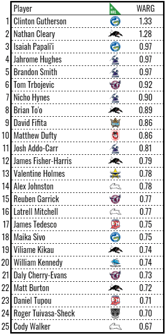 2020 was topped by Daly Cherry-Evans with 2.1 WARG. The career leader (2013 – now) is James Tedesco with 11.3 WARG. The single season record holder is Jarryd Hayne in 2014 with 2.3 WARG.