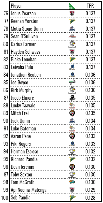 TPR is a rate stat that compares the amount of valuable work done (production) per game, factoring in time on field, to the average player at that position. An average player has a rating of .100. Minimum 5 games need to be played to qualify for TPR.
