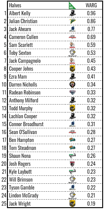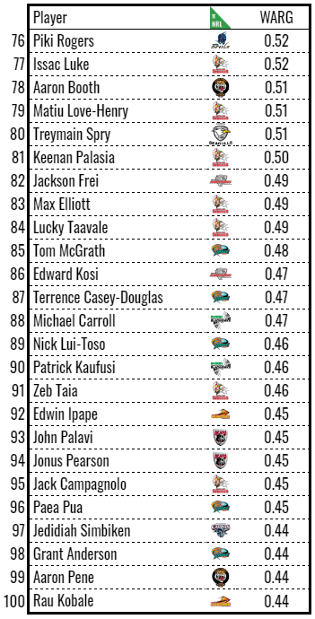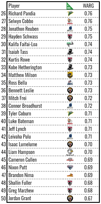 2019 was topped by Harry Grant with 2.6 WARG. The career leader (2016 – now) is Jonathon Reuben with 7.8 WARG. The single season record holder is Scott Drinkwater in 2018 with 3.0 WARG.