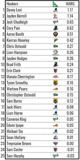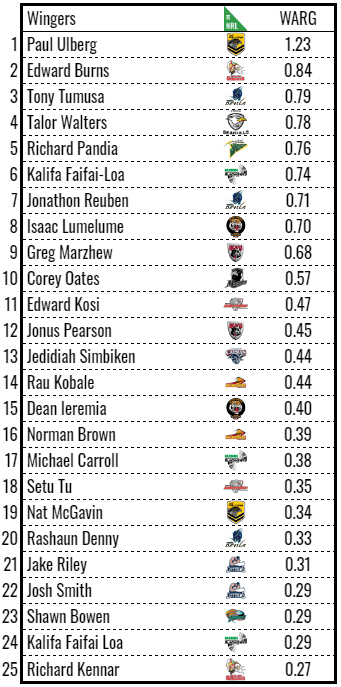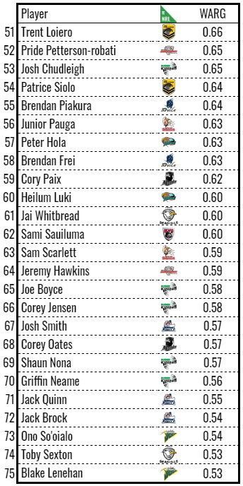 WARG is a volume stat that compares the total amount of valuable work done (production), when compared to a replacement level player (or fringe first grader in the vernacular) at that position, irrespective of the time on field. A replacement level player has 0 WARG. It’s interesting to correlate who is the top of this leaderboard and who has been promoted to the NRL this season.