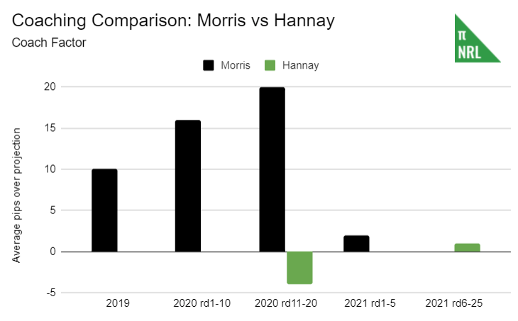 We don’t have any real data on how Fitzgibbon might perform. There are too many variables – personalities, state of the roster, luck – with no data to make an educated guess as to how the Sharks go under his tutelage. We do have some data that we can compare Hannay and Morris, which will let us establish a baseline comparison. If Morris is not significantly better than Hannay, then the club might have been right to punt him. If Morris is better than Hannay, then the club gave up on a finals appearance and, possibly more in the future, for a roll of the dice with Fitzgibbon.
