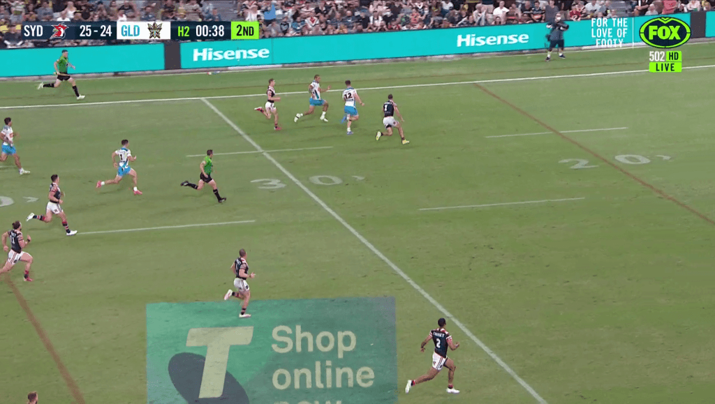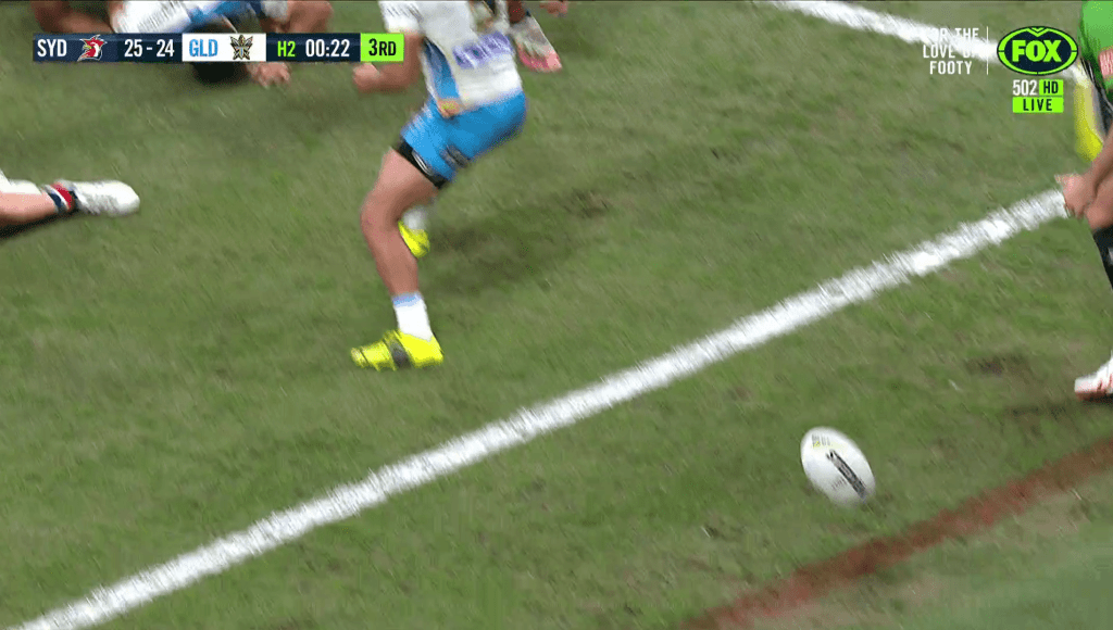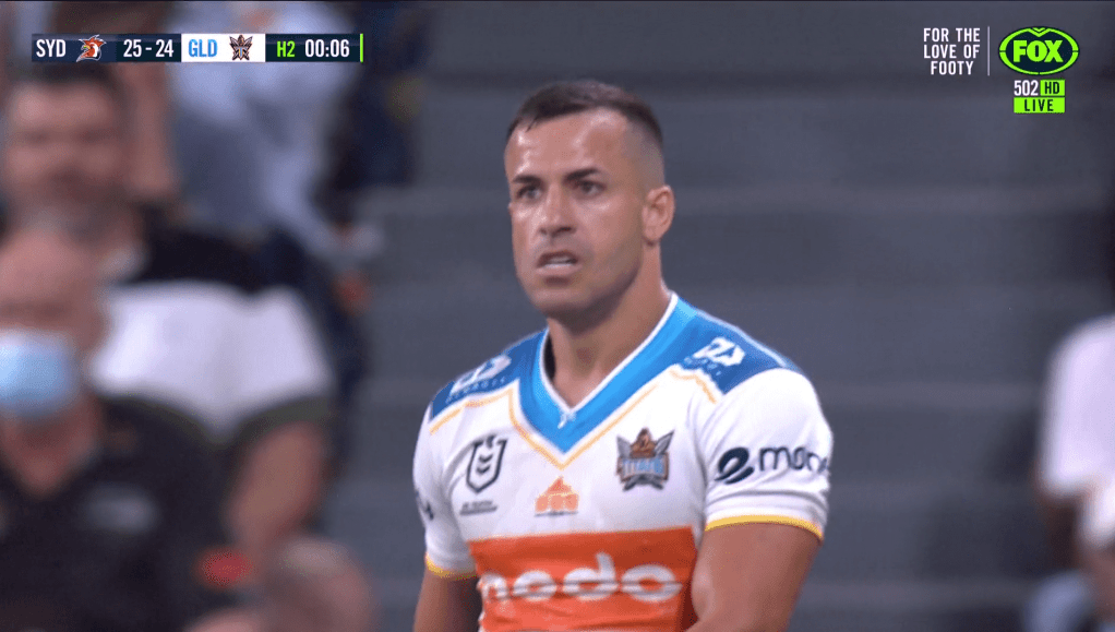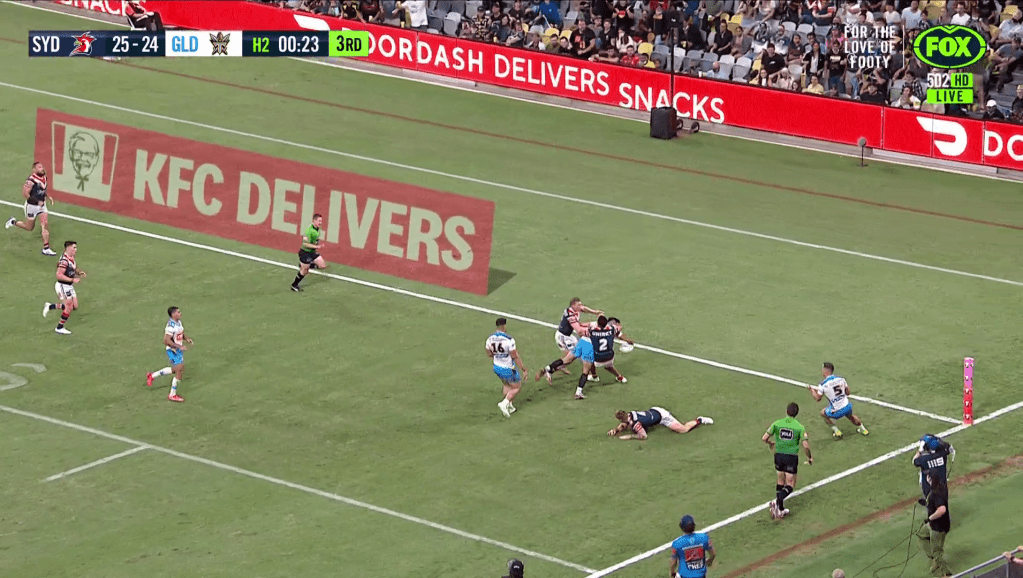 Sami gets tackled 15 metres out. It’s ok though because there’s 36 seconds left on the clock and four tackles. Plenty of time to set up for an equalising field goal or go for a winning try. Although, note the lack of support runners in shot.