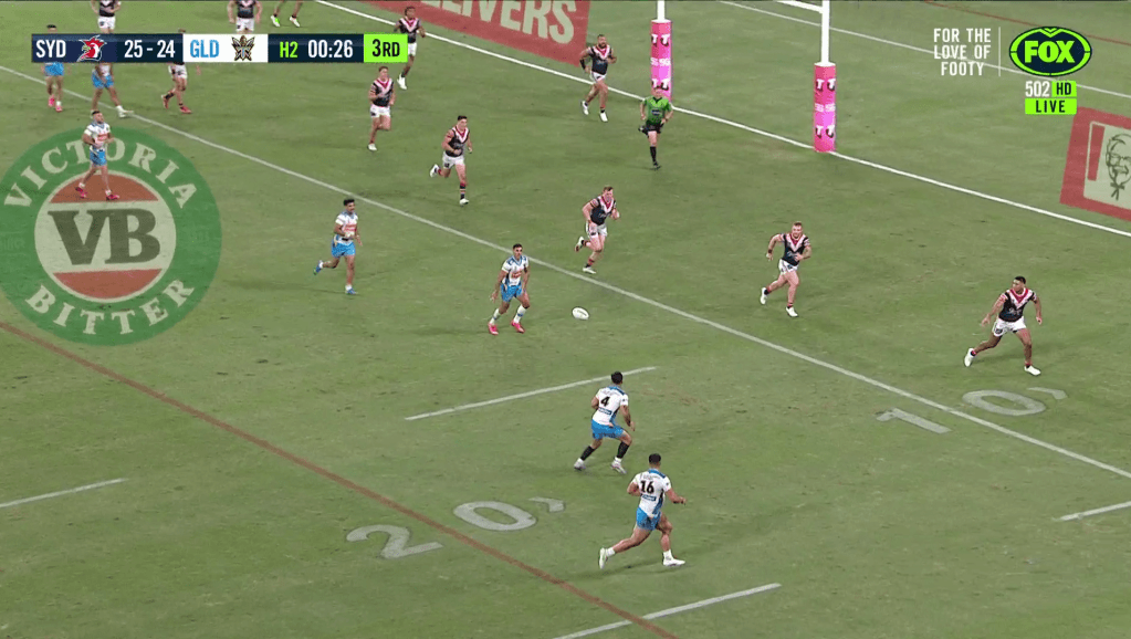 Reinforcements arrive. The ball is sent wide to the other side of the field. Jamal Fogarty pirouettes instead of engaging the line. Patrick Herbert has David Fifita, noted monster, on his right shoulder. Surely he just has to get Fifita the ball and let him barge over.