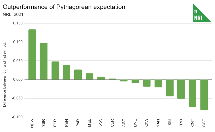 The traditional way of analysing that chart would be to note the differences between actual winning and Pythagorean expectation. The teams that greatly outperform (to the left in the above chart) are typically assigned the status of being ‘lucky’, while the teams that grossly underperform (to the right) are considered ‘unlucky’. The Knights sits at the far left hand side of the chart, their 12-12 record concealing a season we might have expected to yield only eight or nine wins.