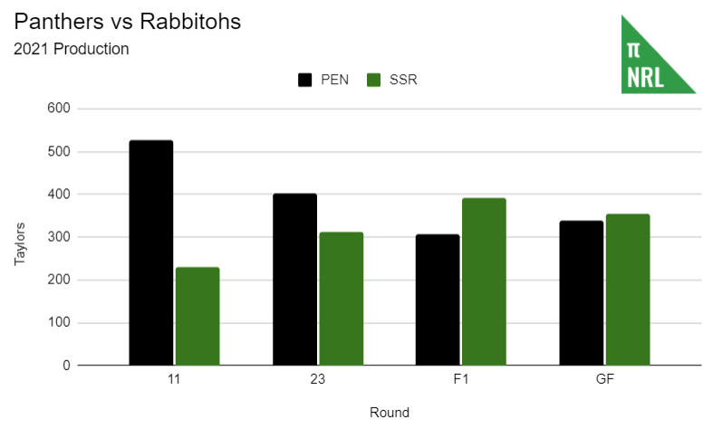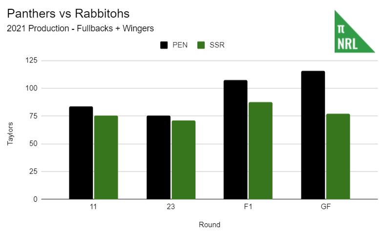 Taaffe put up a TPR of .077 in the grand final, compared to Mitchell’s season average of .120. Obviously, there are no guarantees that Mitchell would have performed at his usual level. After all, Taaffe’s average as starting fullback prior to the grand final was .143 (from a much smaller sample size). However, I think it’s a safe bet that Mitchell would have been more reliably better than Taaffe actually was. Mitchell’s presence probably could have been counted on to add another 15 Taylors. It wouldn’t have eliminated the gap but would have put the game within reach of the Rabbitohs and perhaps minimised the damage done by Paulo.