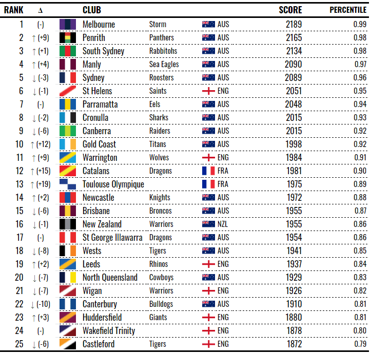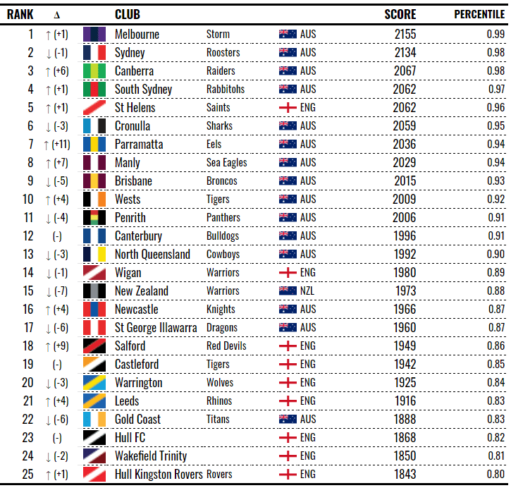 The ranking system rewarded the Storm’s superior offence and class Elo rating over the Panthers’ form Elo and defence. 24 ranking points is not a huge gap and had things gone slightly differently, we might be considering Penrith the number one team in the world.