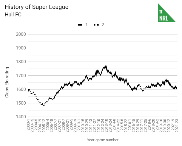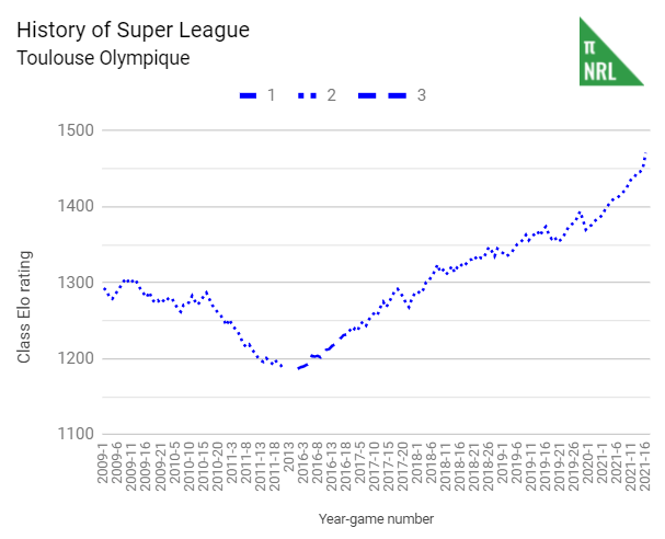 The good news is that Toulouse are odds-on favourites to go back down. The other good news is that they underperformed their Pythagorean expectation by enough that we should expect a little overperformance this year. The bad news is if Olympqiue get their act together, it will be the tricolours and maybe the Devils in the likely firing line. It’s a delicate dance every season and Wakefield need only be really unlucky once to bite the bullet.