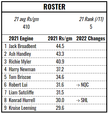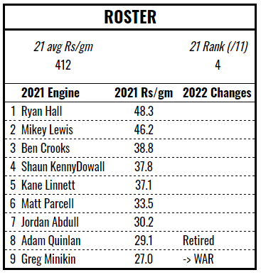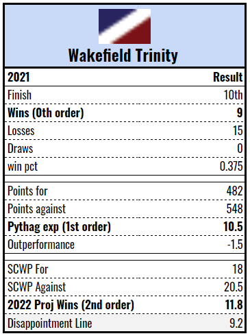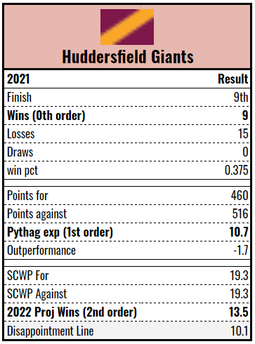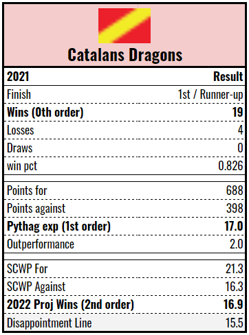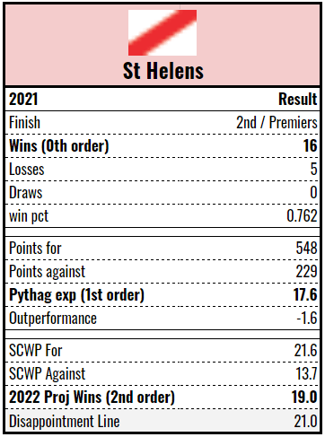 Indeed, the key for the Wolves in 2022 is getting the most out of their key playmakers. Their Pythagorean expectation indicated that their 15-5-1 record was a reasonable reflection of their actual ability but their second order wins (projecting 16+ wins for 2022) and their league topping production as measured by Rismans, suggests there was a lot of points left on the table. New coach Daryl Powell will have his work cut out for him. Still, there’s nothing to really hate and I’d peg them between Leeds and Wigan.
