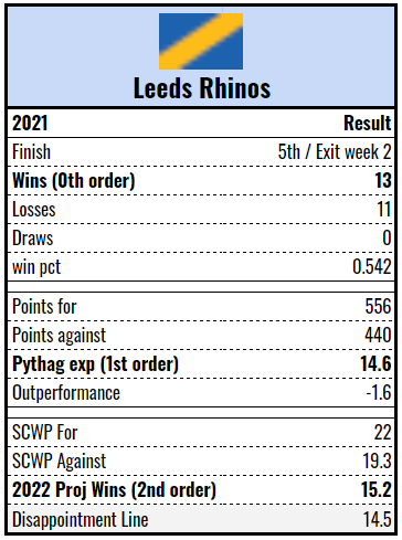 Leeds did enough to make the finals in 2021, knocked off Wigan and then were promptly eliminated from contention by St Helens. It was hardly up to the lofty standards of the Rhinos franchise. They underperformed their Pythagorean expectation, so we should expect more of them this year and look slightly better on this season’s second order wins projection.