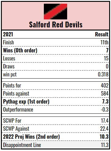 Concerningly, 2021’s record of 7-15 was roughly reflective of both the Red Devils’ Pythagorean expectation and 2nd order wins, so there can be little hope of statistical aberrations explaining the performance. It’s real. At least on the roster front, the losses are manageable. Lolohea’s move to Huddersfield means finding a new half. However, when you consider the gains, you really have to wonder if that’s going to be a net benefit –