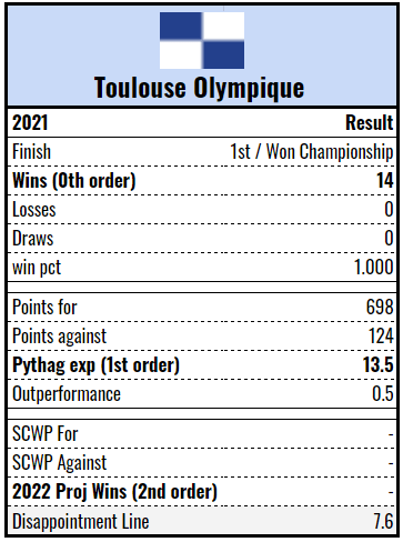 Teams that outperform their Pythagorean expectation in 2021 (more actual wins than 1st order wins) should expect underperformance in 2022 and vice versa. Wins in 2021 are calculated on the number of regular season games played by each club, while wins in 2022 are estimated based on a 27 game regular season. 2nd order wins are used as a “projected wins” for 2022 as it has some predictive power but is based on 2021’s metres and breaks made and does not account for roster changes. Historical statistics are based on Super League (division 1) from 1996 to 2021, the Championship and League 1 (divisions 2 and 3 respectively) from 2003 to 2021 and Challenge Cup results from round 3 on for teams included in the above league seasons. Rismans are not everything and the Engine is selected to reflect the players creating the majority of the production units with a minimum of five games in the dataset (note: not all games had stats recorded). There’s no player data for Toulouse. Transfers in/out are as per Wikipedia on 5 February.