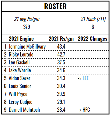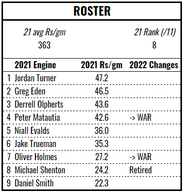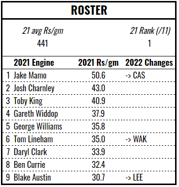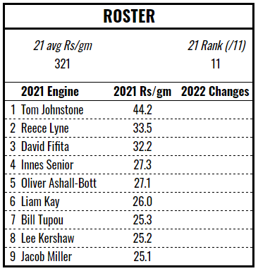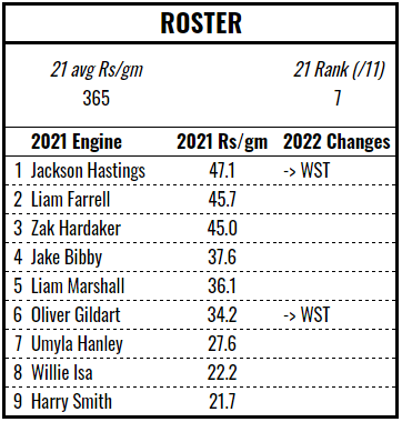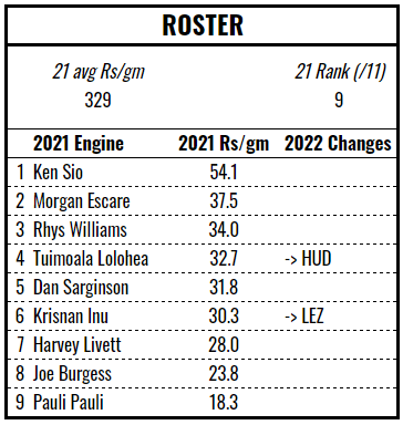 Jake Mamo is a great pick up, one of only three players to exceed 50 Rismans per game in 2021. The other notable gains are Bureta Faraimo and Mahe Fonua, both formerly of Hull’s engine. The losses aren’t too devastating, although will necessarily mean a loss of experience and cohesion. Overall, it’s probably an improvement but the Tigers will need to pounce on any mistakes made by their immediate rivals to find themselves in the top half of the table.