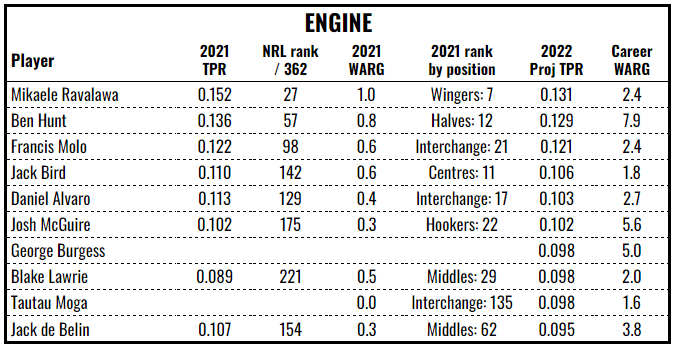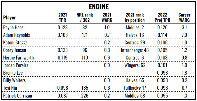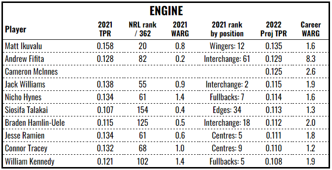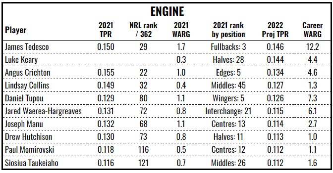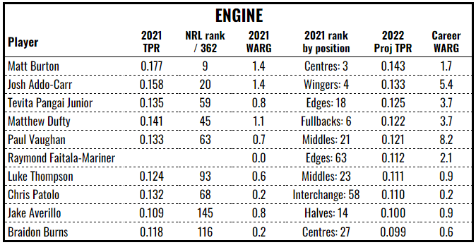 I think the compelling thing about the Sharks is how few brand name players they have. Matt Ikuvalu and a surely-nearly-retired Andrew Fifita top their Engine, presumably out of statistical aberration and padding, rather than any genuinely valuable production. Then we hit McInnes and Hynes and then, some guys. Guys like Tracey, Ramien, Kennedy and Talaki who can all do the job well enough but aren’t considered stars (yet). One of the key deciding factors in how 2022 pans out for Cronulla will be who takes the big steps up into the limelight. Alternatively, they may all play well, grinding out an existence that sees them finish sixth to tenth and, due to the lack of splash, attract very little attention in doing so but the foundations are laid for the Sharks’ next era.