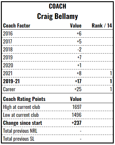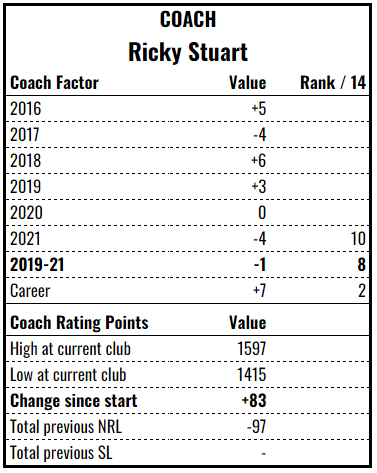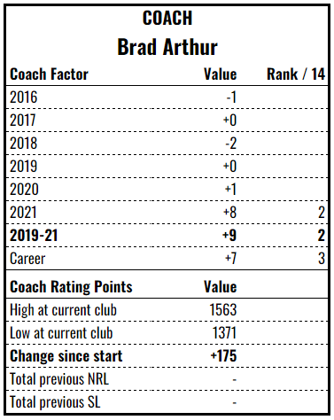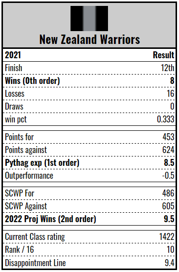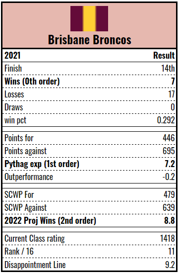 Nathan Brown stinks. I have to say this every year. The Warriors began 2021 as the sixth strongest team on paper by projections. They finished it the twelfth best team and for umpteenth time, a Nathan Brown team grossly underperformed expectations and their own capability. This year he gets to start with the twelfth best squad which, despite being only marginally behind the apparently divine Titans, is expected to be down in the dumps with the worst of them based on how they actually played last year. That’s before we consider how much of a handbrake Brown has been.