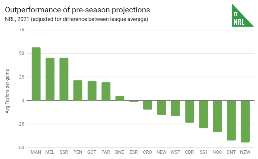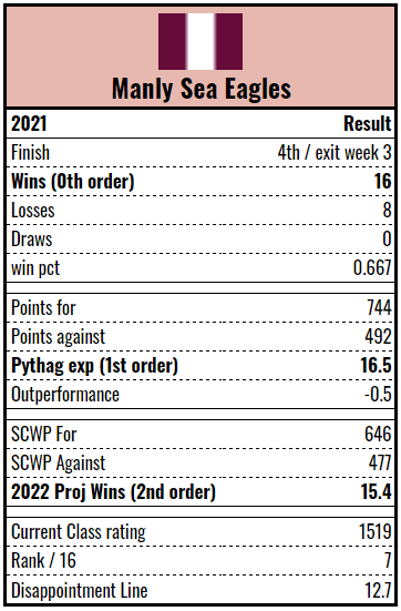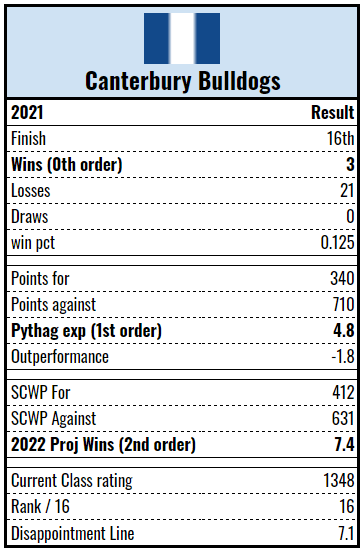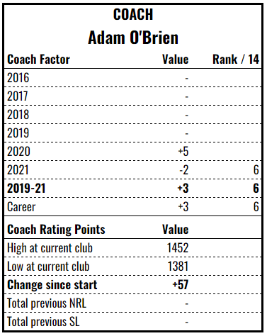 What’s missing is a sense of cohesion and it’s going to be a defining year for Adam O’Brien’s credentials as coach if he can deal with this kind of churn (partly arising from player movements and partly arising from injuries) to not only maintain a soft top eight finish but make an actual push up the ladder. His coach factor of +5 in 2020 is offset by a mean regressing -2 in 2021, so he needs a big positive number to beat the mediocre projections and just to maintain the Knights’ standing. He’s going to have find something special to go further. I’ve had my doubts about O’Brien for a while – he’s an upgrade on Brown but who isn’t? – and its time for rubber to hit road.