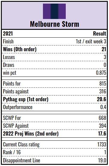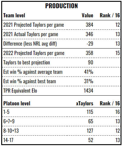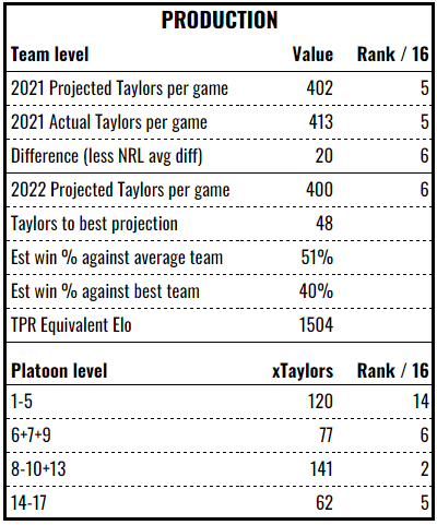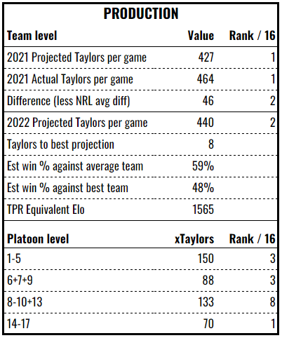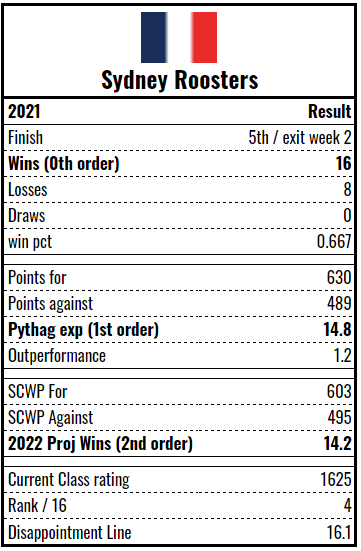 The numbers for the Roosters are not crash hot. They noticeably outplayed their Pythagorean expectation and have only the fifth best squad on paper. However and famously, footy is not played on paper, which is why I am more than willing to overlook the statistics, that some nerd made up, to anoit the Roosters with my personal 2022 premiership favouritism.