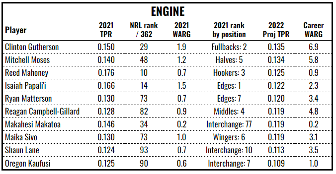 Rosters for the Composition metrics are taken from the NRL website as of 28 February and the predicted 1-17 for the Production metrics are based on League Unlimited’s season previews. The engines are based on the top ten non-rookies by their projected TPR, as a rough proxy for the players that are likely to contribute the most production (typically, more than half of a team’s production comes from eight or so players). Players with a 2021 ranking but no TPR did not play in the minimum five games played required for a TPR (no minimum games for WARG). Players are ranked by WARG accumulated while listed in that position only and the best rank the player has is shown (e.g. if a player has played in the middle and off the bench, I’ve shown whichever had the higher ranking).
