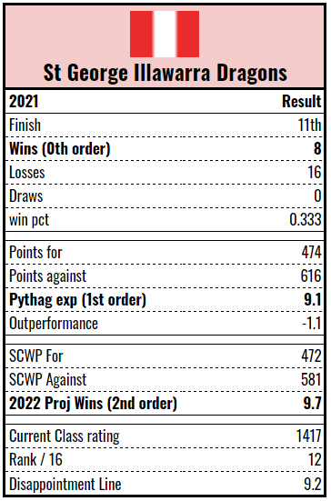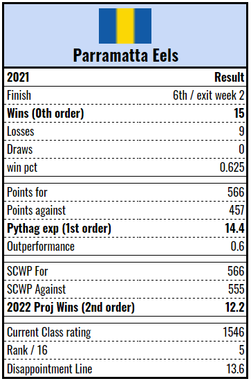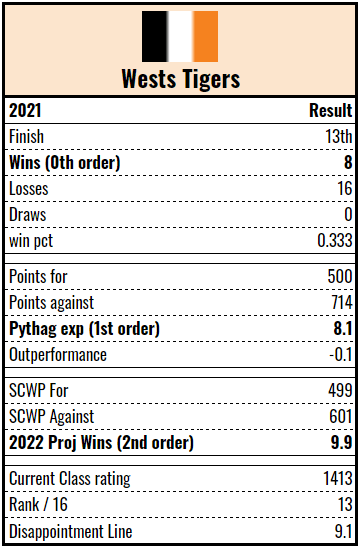 Newcastle had an odd 2021. Their 12 wins belied a points difference that suggested they were more like a 9 win team. Even the more forgiving SWCP had them pegged at 10.5 wins. In a normal year, they would’ve been clear cut candidates to miss the finals. This is doubly baffling as only the Bulldogs scored fewer points. In a season notable for its record setting points hauls, the Knights cracked thirty three times (against the Dogs, Cows and Raiders) and failed to crack double digits five times (against the Panthers, Storm, Eels and Roosters twice). That is an unforgivably poor offence and still, in 2021, they finished seventh and nearly made it to week 2 of the finals. The heavy dose of mean regression, as they surely cannot rely on fluking wins while being that poor with ball in hand with a league average defence, that the Knights should experience will be a handbrake on any upward momentum the club has going into 2022.