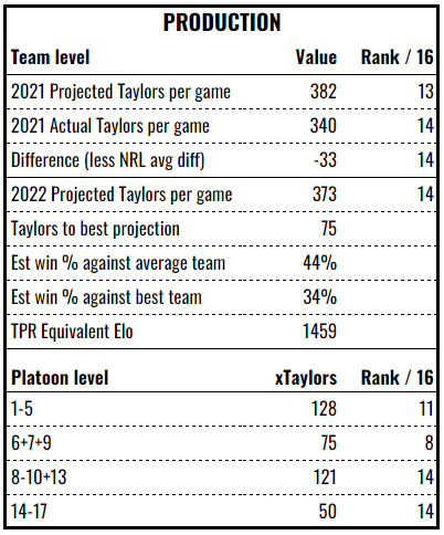 It was a rough year for the Raiders, the kind we seem to see after they’ve tried to crest the summit and tumbled back down again. That’s reflected in the Raiders’ engine, which has only two top ten players by position. It’s down from four last year, a list that featured Wighton, Papalii, Nicoll-Klokstad and Starling, who all had off years for varying reasons. Nicoll-Klokstad spent most of the season on the sidelines. Starling failed to recapture his 2020 form, producing 70% as many Taylors in 2021 compared to 2020 despite spending 42% more minutes on the field. Wighton looked at times like he’d never seen a game of football before, despite his status as the reigning Dally M Player of the Year.