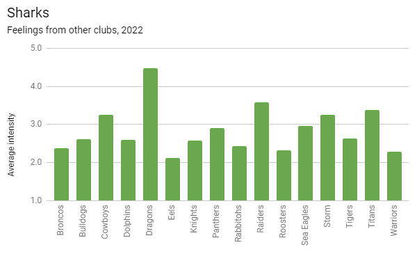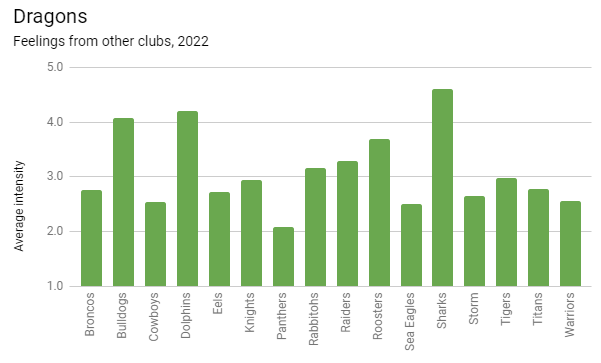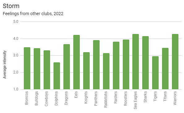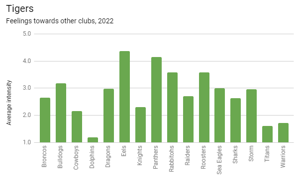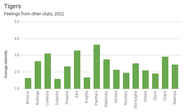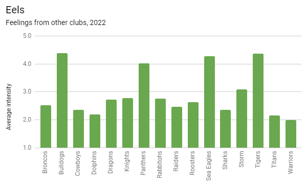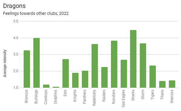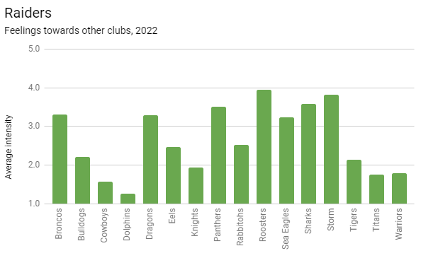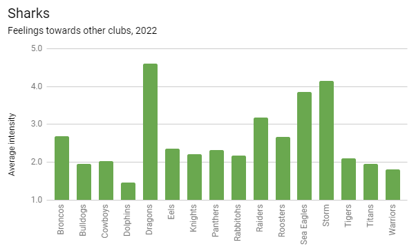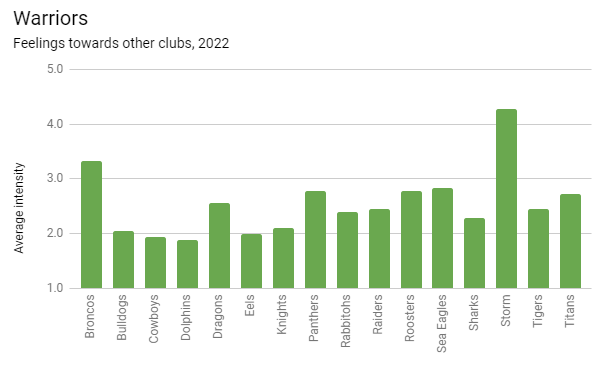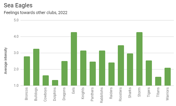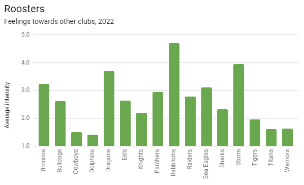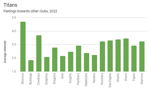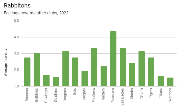While the numbers themselves might be slightly skewed (the average is 2.7, which suggests again that some but not all respondents put apathy in the middle, rather than at the lower end), the trend is clear and I think if you were to rank clubs from most to least hated across the NRL fanbase, this would be a pretty good reflection.