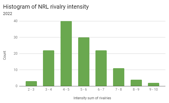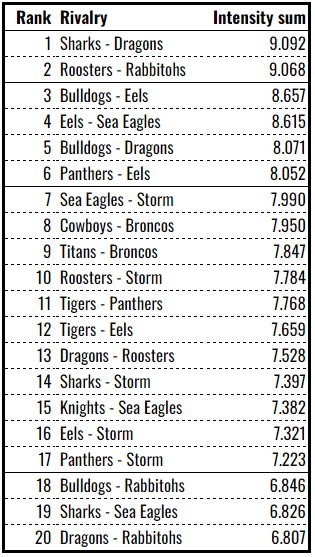 Of the 72 pairings rated at least a sum of 5 (an average intensity across both sides greater than 2.5), the bulk were made up in part by the Storm (15 appearances), Broncos (13), Roosters (12), Dragons and Sea Eagles (11 each) and Eels (10).
