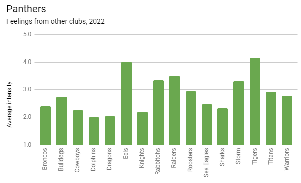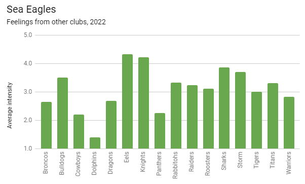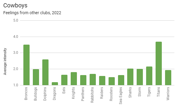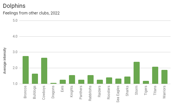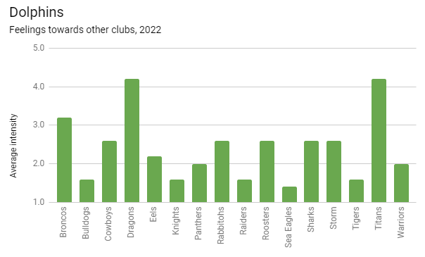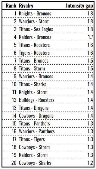 The following shows the biggest gaps in intensity of feelings (e.g. the Knights rated the Broncos 3.7 but the Broncos rated the Knights only 1.9, resulting in a gap of 1.8), excluding the Dolphins’ responses: