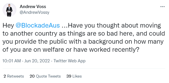What I find surprising is not that he holds these views, but it’s his failure to read the very obvious vibe of the room. Voss proffers some truly ancient talking points. The invective of dole bludgers and greenies had its day in the 90s. It’s now thirty years and a new century later. If I was being charitable, I’d suggest he was using his platform to troll for talkback content. Surely not.