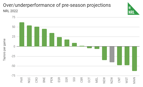 Their defence was the worst in the NRL, conceding an even 700 points in 24 games, and the worst in Warriors franchise history. The only team that came close to their 29.2 points conceded per game were the 2004 squad (28.9), who finished dead ass last that year. The Warriors’ attack was marginally better, cracking 400 points for thirteenth best in the NRL, and only the worst franchise performance since 2009. Their Pythagorean expectation was 6.3 wins, so they finished exactly where they should have.