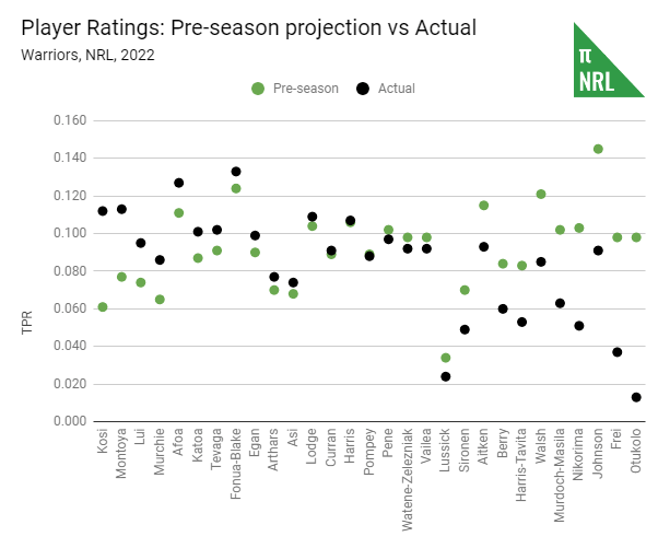 Unless your name was Marcelo Montoya or Ed Kosi, the outperformance was at best marginal. We see underperformance the board, with some of the biggest names being the worst offenders. Six Warriors of the 29 that played at least five games produced TPRs functionally equivalent to replacement level players, including Kodi Nikorima, Curtis Sironen and Chanel Harris-Tavita.