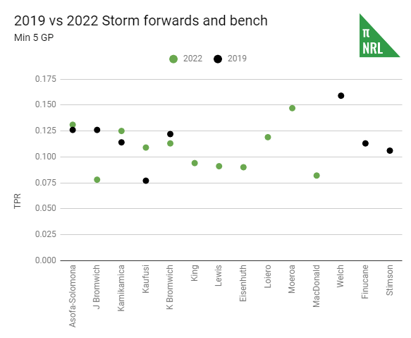 The main takeaway is that there are more black dots above the .100 line and more green ones below. The margins aren’t immediately obvious but we’re talking about the difference between fifth and first, and the difference between a week one exit against Canberra and a preliminary final loss against the eventual premiers. That gap is not huge on the field – the Pythagorean expectation for both seasons were separated by just two wins – but the perception of the end result is. Still, the Storm didn’t have anywhere near enough this year to seriously challenge.