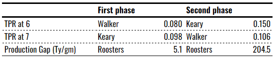 The production gap is the difference between the Roosters’ production and their opposition. While the losses will drag that average down, something they didn’t experience in the second phase, when the Roosters out-produced their opposition in the first phase, they only did so by an average of 115 Taylors per game. An increase of 90 Taylors per game between the phases is significant and seems to largely have come from Keary being more comfortable playing 6 than 7, unlocking a backline that went from scoring 21 points per game to 37.