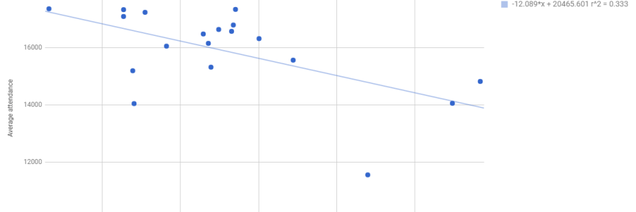 Most rugby league commentators wouldn’t know what a linear regression is or how do one. I’m no different but I do like to compare two variables and see if they’re correlated. A scatter plot with a linear trendline and an R-squared – remember R-squared goes from 0, no correlation, to 1, perfect correlation; I usually… Read More Analysis – The more competitive the season, the more bums on seats